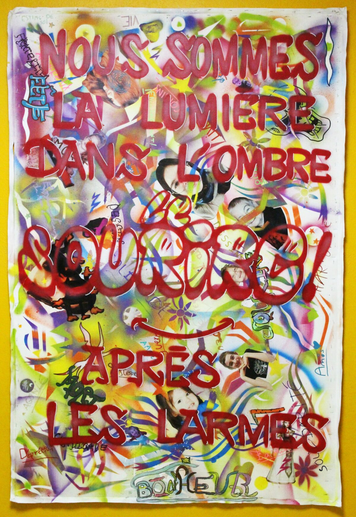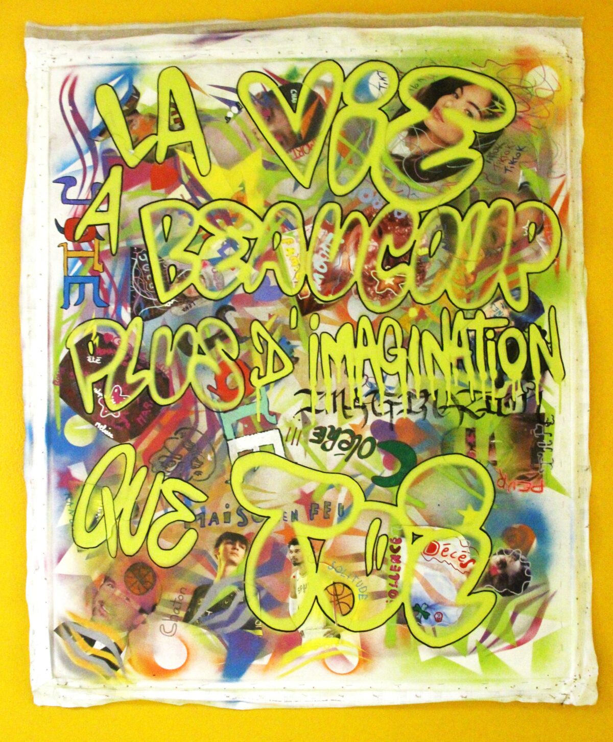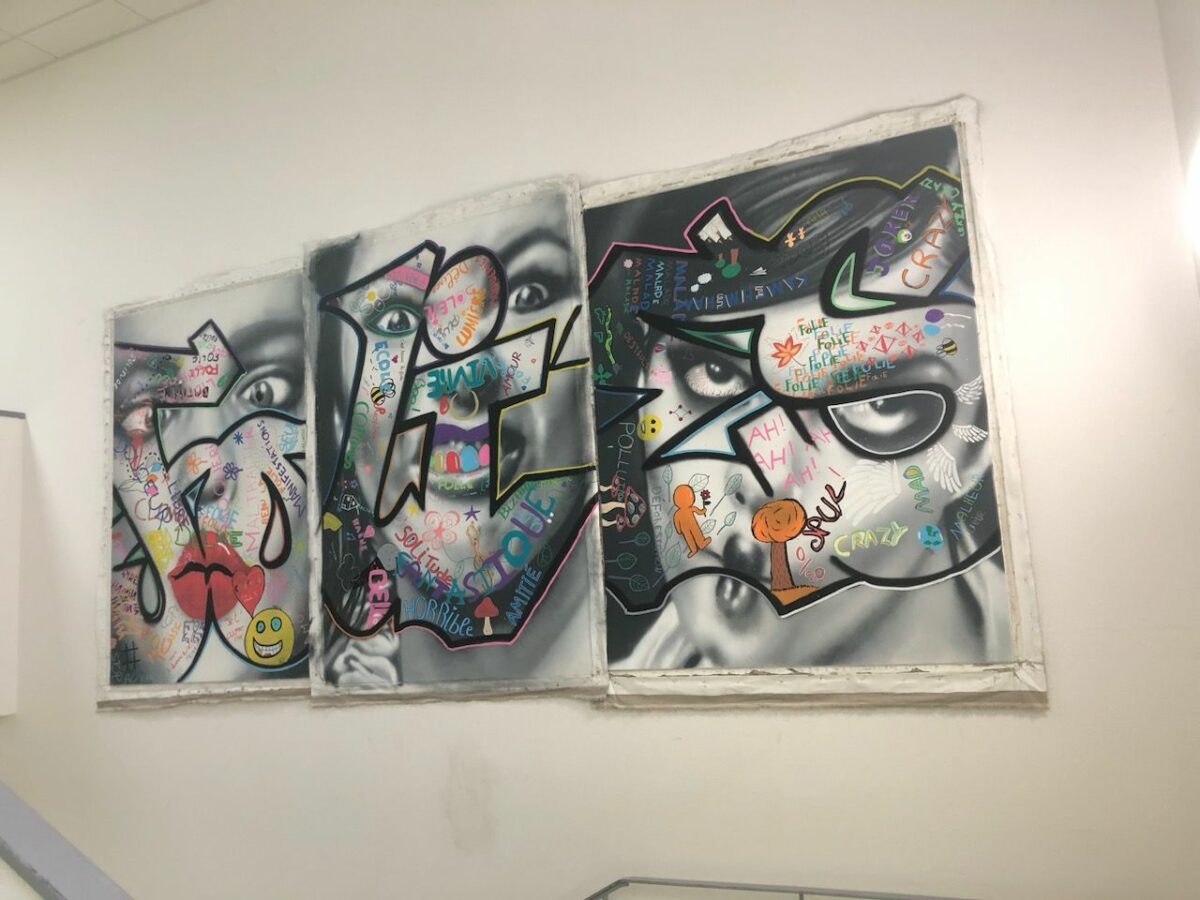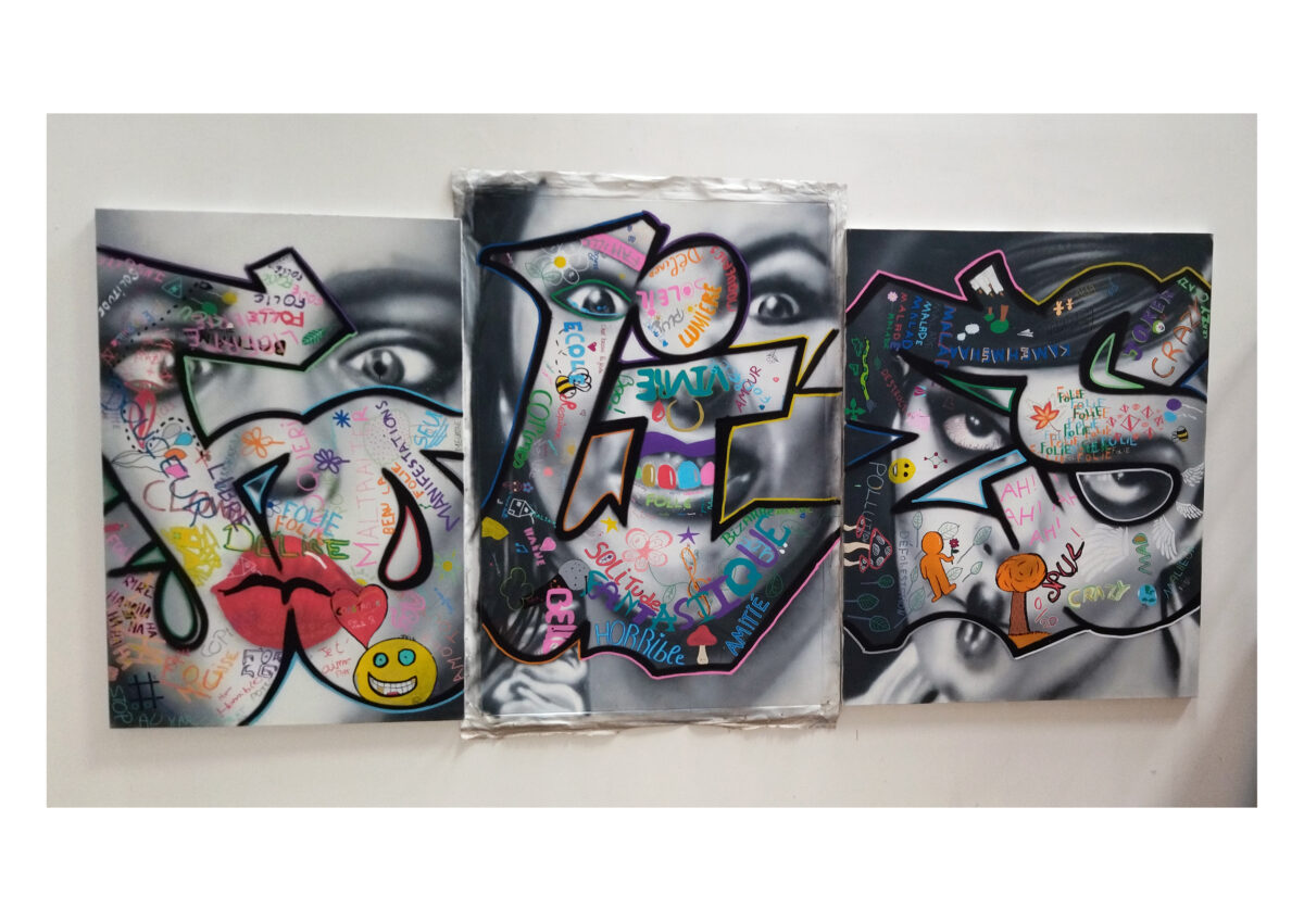 Style : Caractérisé par des couleurs vives (bleu, rose, noir), des motifs abstraits et des personnages stylisés (anges, démons). Ses toiles, comme « Trouble Fait » (1990/2025), utilisent des textures brillantes et des influences pop-graffiti.